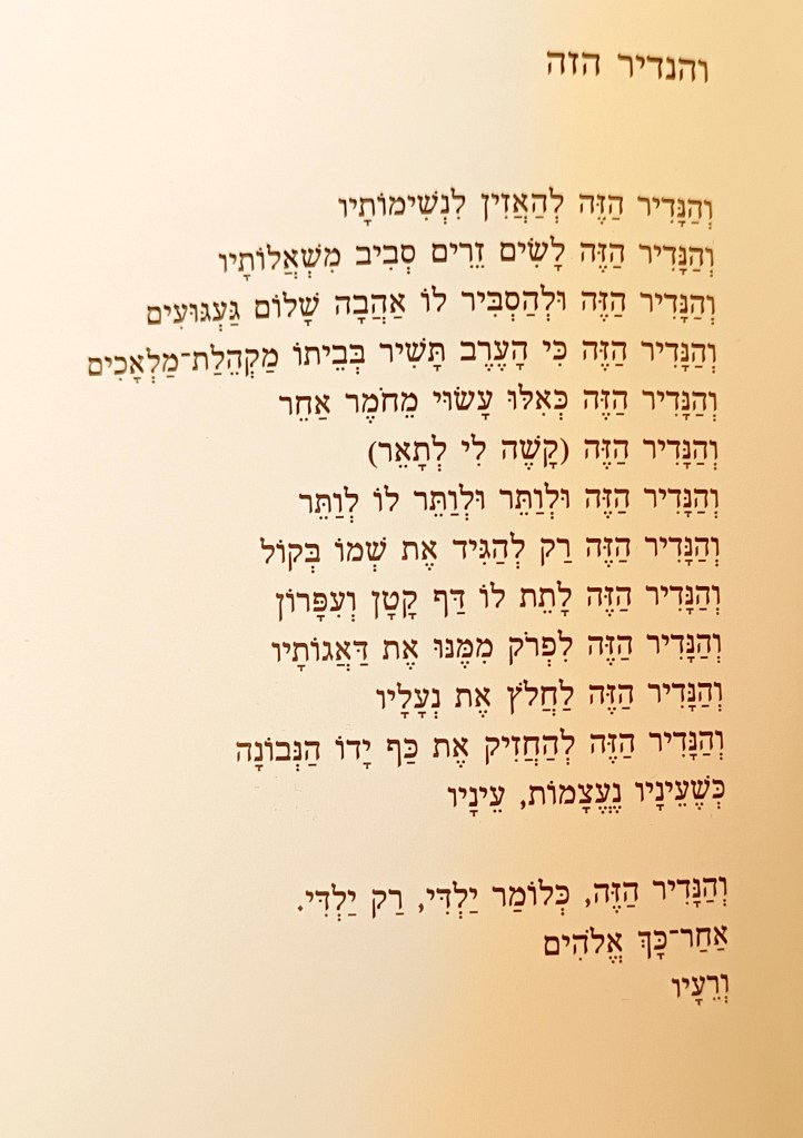 דורות של אמניות ואמנים ניסו ומנסים לפצח כיצד לתפוס את הרגע המאגי של הפיכתם להורים למעשה אמנותי ללא נפילה למלכודות הקיטש או המובן מאליו. הרכבי, כמכשפת המילים שהיא, עושה זאת כבר מהאות הראשונה בשיר שמובא לפניכן שנפתח ב'ו' החיבור. כי מה היא לידה אם לא תזכורת לכך שהיה לפנינו משהו, להיותנו חוליה קטנה ברצף הגדול של החיים? השימוש החוזר בכינוי הרמז "זה" מתחילת השיר מחזק את התחושה שהיה משהו לפני, משהו שברור שאליו מתיחסת הרכבי ובו בזמן משאירה אותו תחת ערפול, תוך כדי שעצם הערפול משמש אותה ליצירת הלחש הפואטי. סופו של השיר כמו מצמצם את האפשרויות השונות שיכלו לעלות בראשה של הקוראת לגבי "הזה" שכן הן אומרות במפורש: "והנדיר הזה, כלומר ילדי, רק ילדי." אבל הפרשנות החתומה ישר נפרמת בשורות המסיימות את השיר "אחר-כך אלהים/ ורעיו"- והמרחב הזה בין הילד הפרטי לבין האלהים ורעיו הוא המרחב בו השיר הזה יכול להלך את קסמו. היא המרחב בו הנס האישי יכול להפוך לרגע המיתי, הלא ידוע שבו החיים והטרגדיה המובנית בתוכם יכולים להלך את קסמם.